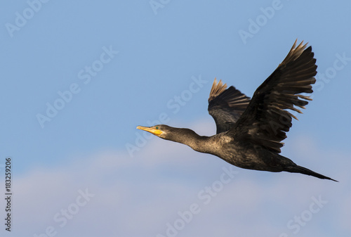 Neotropic cormorant (Phalacrocorax brasilianus) flying, Galveston, Texas, USA