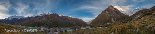 Nepalese village under snow mountain