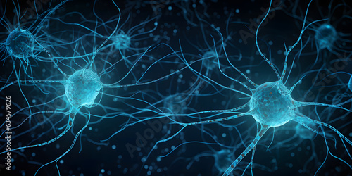 Nerve cell blue color banner, system neuron of brain with synapses. Medicine biology background. Generation AI