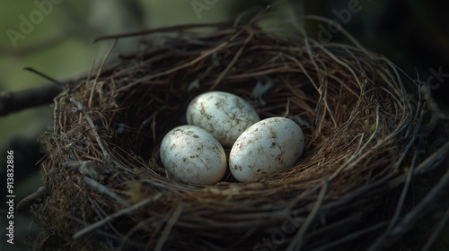 nest with eggs, bird nest with eggs, A detailed shot of a bird’s nest with eggs, highlighting the delicate and intricate nature of the nest