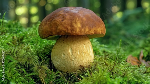 Nestled amidst verdant moss, Boletus Edulis, a prized forest delicacy, basks in the sunlight. Its golden-brown cap and sturdy stalk create a captivating sight against the lush backdrop
