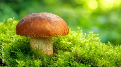 Nestled amidst verdant moss, Boletus Edulis, a prized forest delicacy, basks in the sunlight. Its golden-brown cap and sturdy stalk create a captivating sight against the lush backdrop