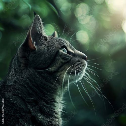 Nestled among lush greenery, a striped tabby cat gazes into the distance, captivated by the play of light through the trees, embodying curiosity and tranquility