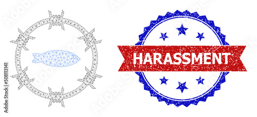 Net fish arrest polygonal carcass icon, and bicolor rubber Harassment seal stamp. Red stamp seal includes Harassment tag inside ribbon and blue rosette. Vector frame polygonal mesh fish arrest icon.