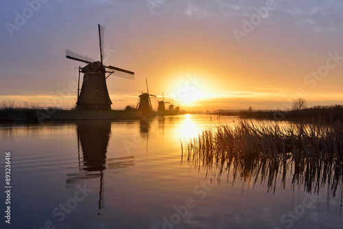 Netherlands, South Holland, Kinderdijk, Row of historic windmills at sunset