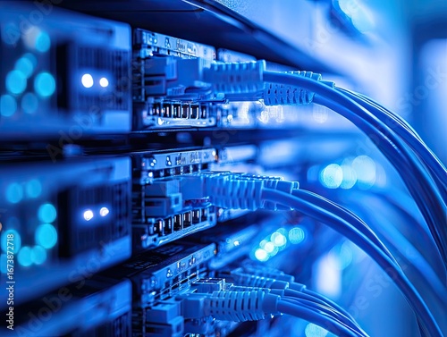 Network equipment, blue cables, server rack