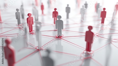 Network of Red and Gray Paper People Figures Connected by Red Strings on White Surface