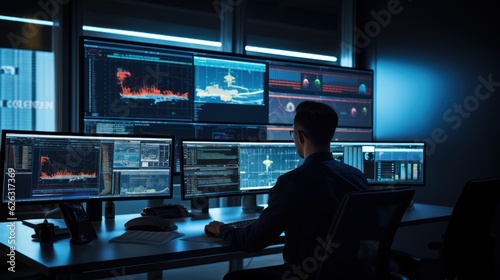 Network operations center ( NOC) with technicians monitoring network traffic, troubleshooting issues, and ensuring network performance