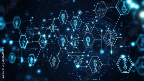 Networked hexagonal icons displaying innovation, research, and technology concepts, interconnected by glowing lines