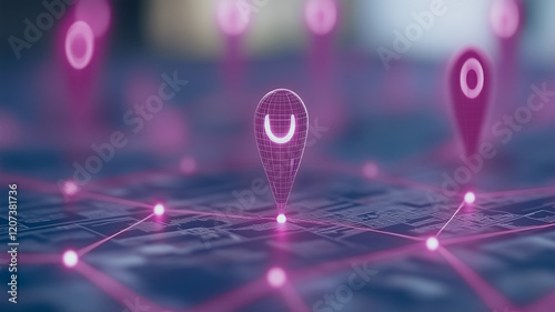 Networked Locations: Glowing pink location markers connect across a digital map, symbolizing global connectivity and network reach.