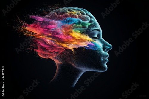 Neural activity neural stimulation brain function thought motion and thought motion vibrant neural activity represented by a colorful human head silhouette on a black background