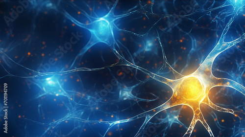 Neural network brain cells yellow blue. Human nervous system or Neurons. Background with copy space.
