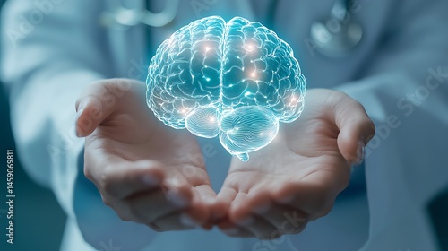 Neurology, Brain Health, Medical Innovation: A Doctor's Hands Gently Cradle a Glowing, High-Tech 3D Brain Scan, Representing Advanced Neurological Care and Research.