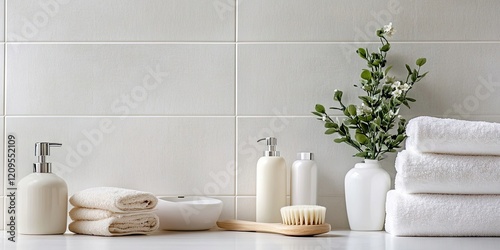 Neutral bathroom accessories featuring white towels, a plant, and assorted bottles on a light table against a soft tiled wall for spa aesthetics.