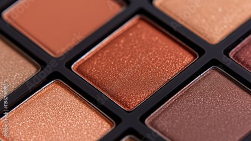 Neutral eyeshadow palette with brown and coral shades. Cosmetic product, makeup and beauty concept. Image for makeup packaging and beauty ads. Top view with copy space.