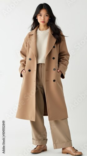 Neutral Fall Fashion Model Portrait in Stylish Outfit for Women – Elegant Coat, Jacket, and Layered Look for Autumn Fashion Photography