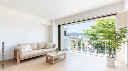 Neutral Minimalist Balcony with Wooden Flooring and Soft Seating for Relaxing and Enjoying Outdoor Views