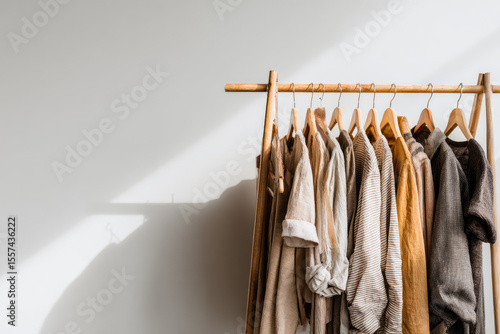 Neutral toned clothing rack wooden hangers minimalist style natural fabric sunlight cozy atmosphere subtle pride flag modern interior casual wear home decor