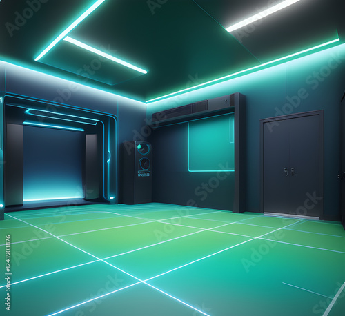 New blue geometric interior with mock up place on walls. Exhibition, gallery and layout concept.office interior room. blurry working space with defocused effect.generative ai