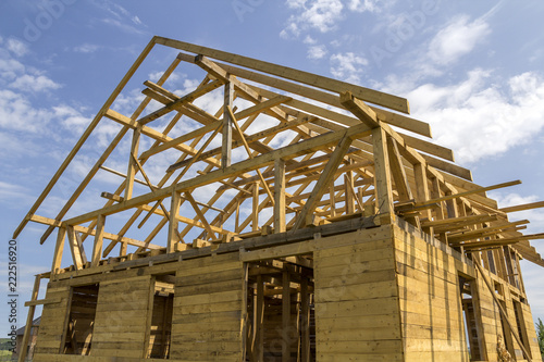 New cottage of natural ecological lumber materials under construction in green field. Wooden walls and steep roof frame. Property, investment, professional building and reconstruction concept.