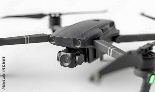 New dark grey drone quadcopter with digital camera and sensors flying isolated on white.
