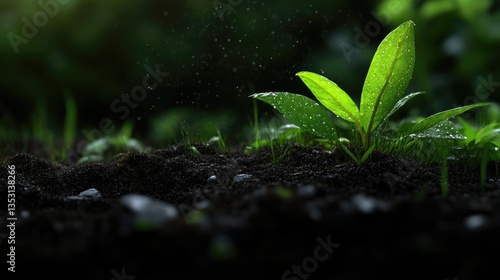 New growth emerging from the earth. A vibrant sprout, glistening with morning dew, pushes upward through rich, dark soil