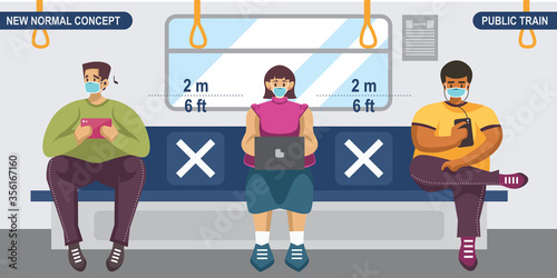 New normal social distancing concept. People wearing medical mask, sitting on public subway train and keeping distance to protect from COVID-19 Coronavirus. Scalable and editable vector illustration.