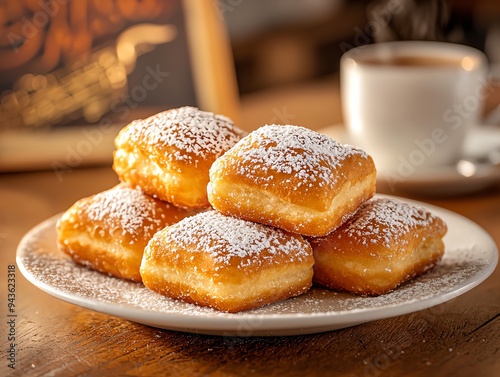 New Orleans beignets dusted with powdered sugar, served on a white plate, with a cup of cafe au lait and a jazz poster in the background