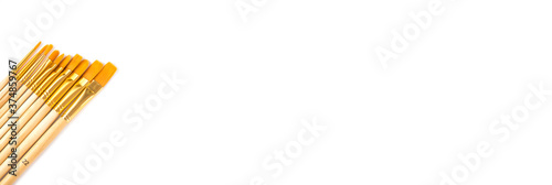 New paint brushes of different sizes on a wooden handle isolated on white background.Long banner isolated on white background.Copy space