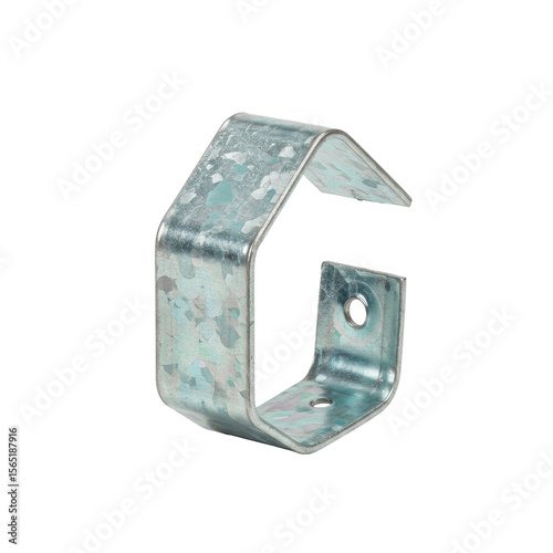 New silver-toned galvanized steel industrial-grade conduit hanger/strap with metallic sheen, functional design, and clear contours, isolated on a transparent seamless studio background. Concept of