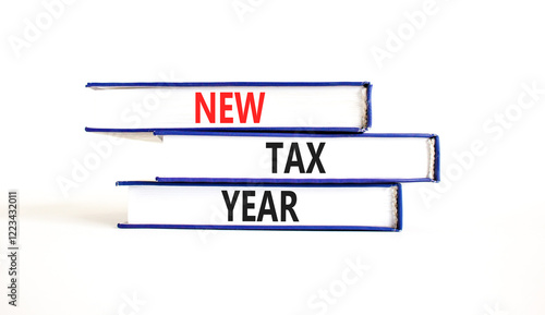 New tax year symbol. Concept words New tax year on beautiful blue white books. Beautiful white background. Business new tax year concept. Copy space.