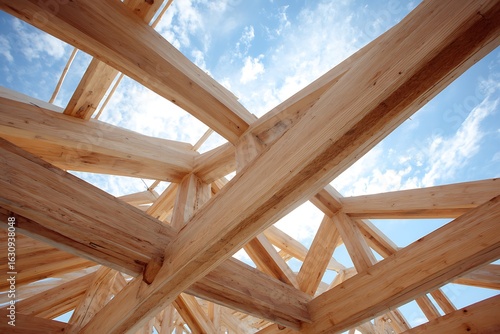 New Wooden Roof Framework Against Blue Sky, Construction Site, Timber Frame, Building a House, Wood Beams, Carpentry