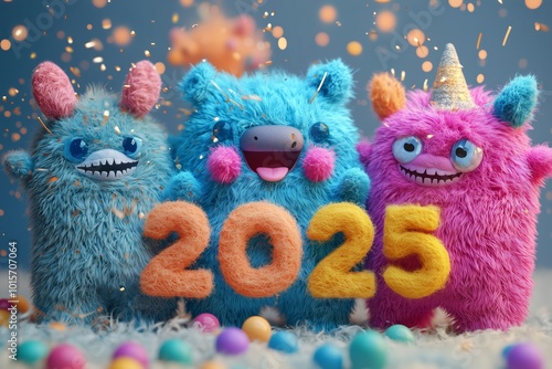 new year "2025" 3D text, vibrant colors, and cute fluffy wool monster background