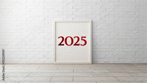 New Year 2025 White Brick Wall - Minimalist image, white brick wall, framed number 2025, new beginnings, future planning, anticipation.