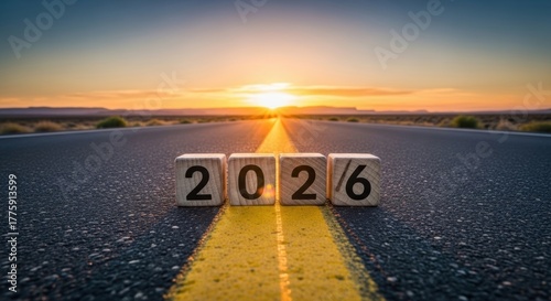New Year 2026 on the horizon: Wooden blocks on road at sunset symbolizing future goals