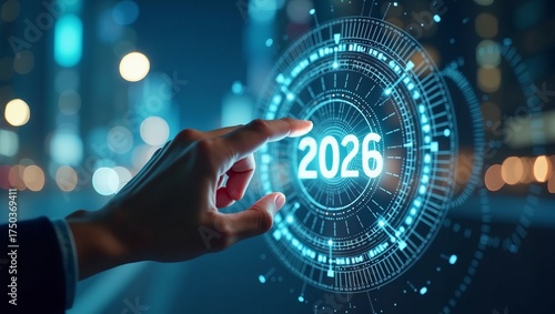 New year 2026 technology and future business planning concept with hand touching a futuristic holographic interface