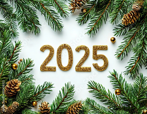 New Year background and text 2025 in gold letters. fir branches and Christmas decorations.