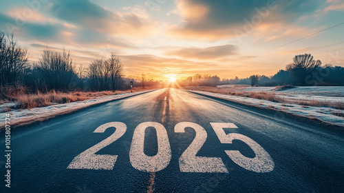 New year concept, empty asphalt road leading into the distance with number 2025 written on it and cloudy sunset sky with shining sun in background