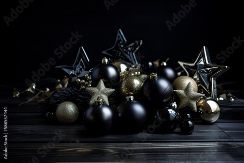 New Year decorations on black wood. - Generative Ai - Festive, Celebration, Party, Holiday, Winter, January, Countdown, Tradition, Ornament,.