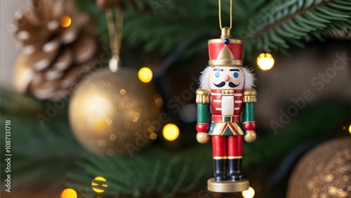 New Year or Christmas tree toy "Nutcracker" hangs on a decorated fir tree