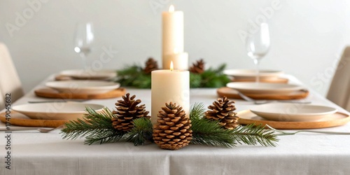 New Year Productivity & Holiday wellness concept. Elegant holiday dining table set with candles, pinecones, and greenery for a festive atmosphere.