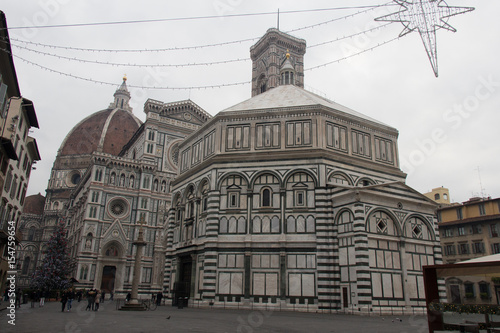 New Year Tree on Piazza del Duomo, Duomo Santa Maria del Fiore and Baptistery of Saint John. Florence, Italy.
