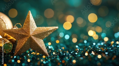 New years Christmas gold green star background with copy space. Christmas teal green and golden abstract glitter bokeh background. Selective focus