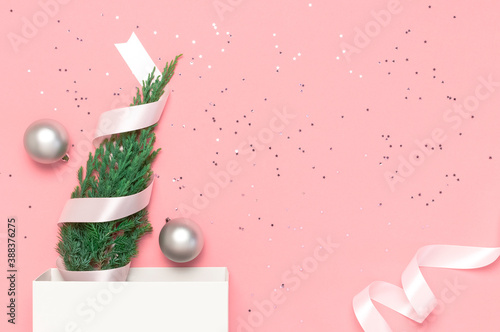 New Year's composition, winter decoration. Silver Christmas toy balls, holiday ribbons, christmas tree branches white gift bag on pink background. Flat lay top view copy space. Celebration concept