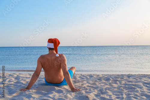 new year's eve on the beach by the sea. a man in a Christmas hat is sunbathing in the sun. blue sky like a copy space
