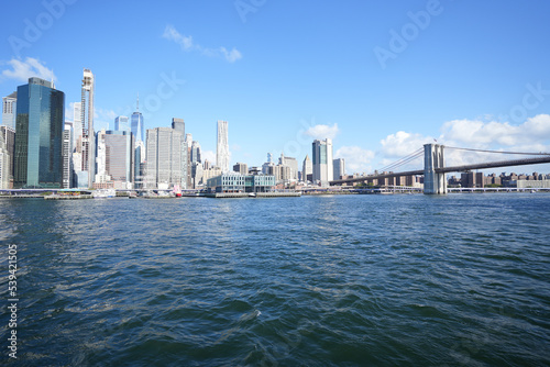 New York City, New York USA - September 2022. Manhattan bridge. Iron bridge view. Historic New York place. Brick wall buildings. Brownstone building.