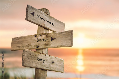 newborn baby boy text quote on wooden crossroad signpost outdoors on beach with pink pastel sunset colors. Romantic theme.