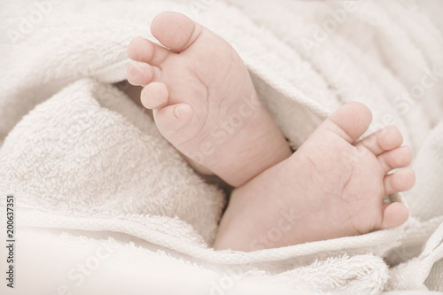 Newborn baby feet on a white towel.Toned