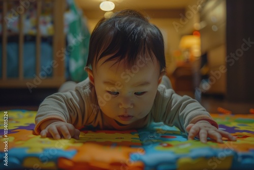 Newborn baby learning to crawl on a colorful play mat in a cozy room
