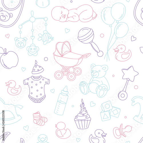 Newborn baby shower nursery seamless pattern thin line doodle cartoon